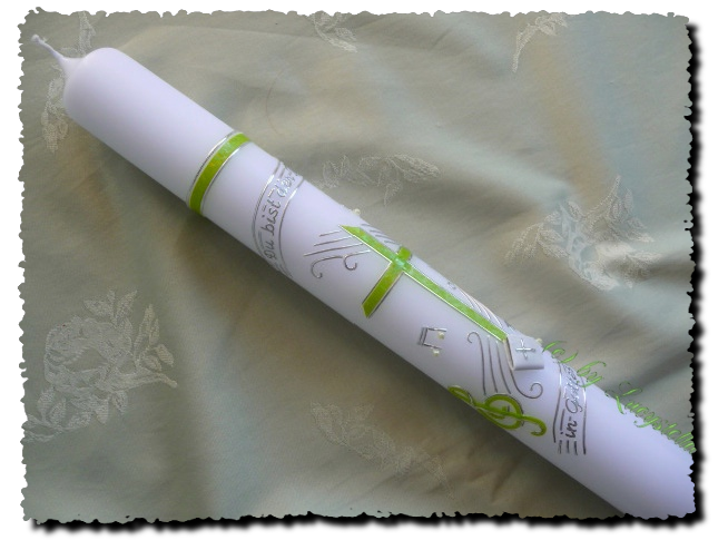 Kommunionkerze Motto 'Du bist ein Ton in Gottes Melodie' glitzergrün silber