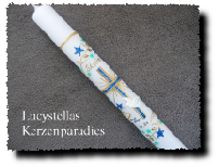 Kommunionkerze Trend Kreuz Rahmen Engel Sterne Strass hellblau silber