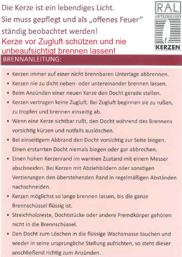 Die Kerzen, die ich Euch anbiete, werden alle in Deutschland hergestellt und tragen das RAL-Gütesiegel für Qualitätskerzen.